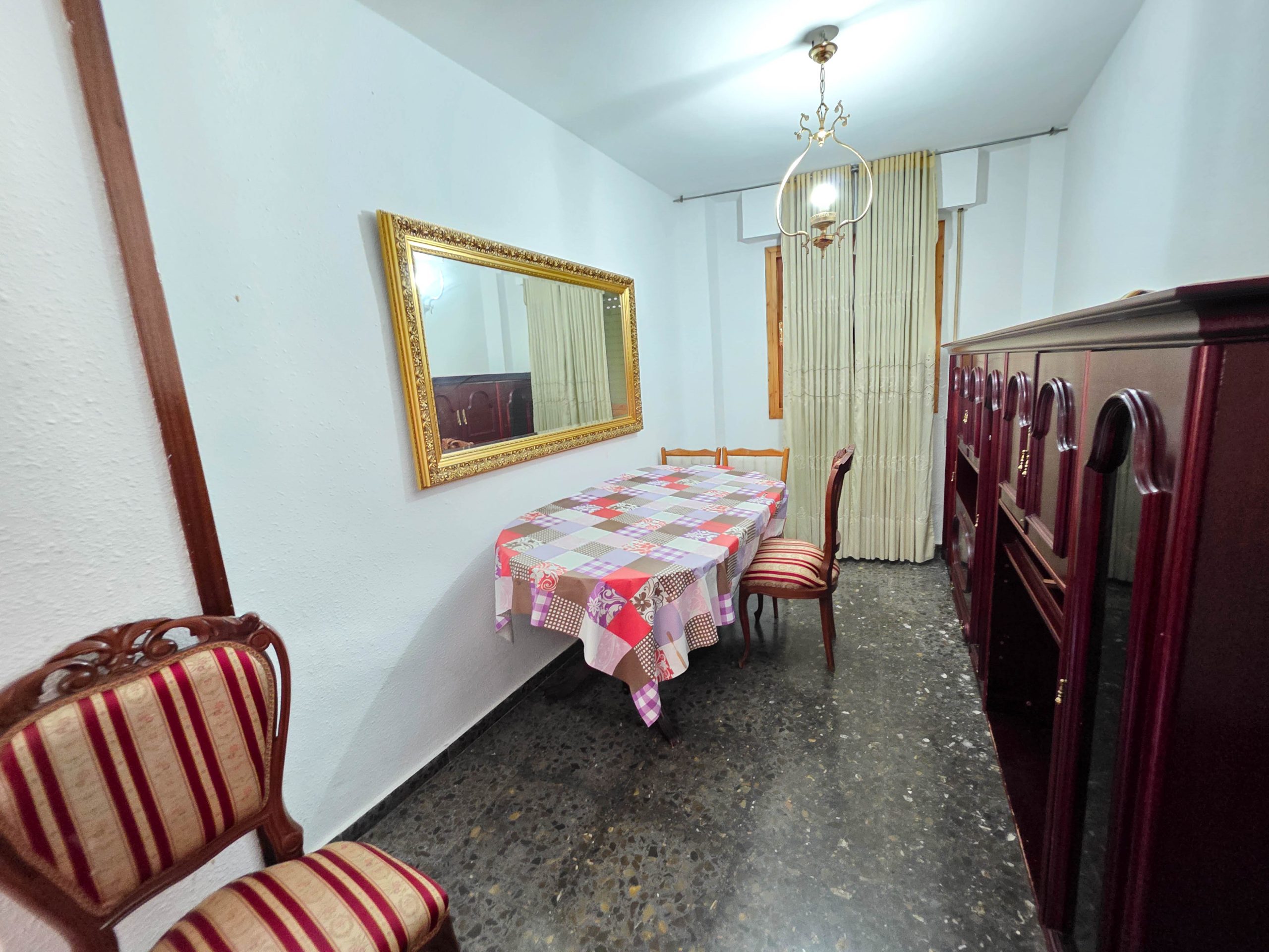 La vivienda se compone de salón independiente con acceso a uno de los balcones con vistas a la plaza, cocina independiente con lavadero y salida a patio, cuatro dormitorios, un baño completo con bañera y un aseo adicional.